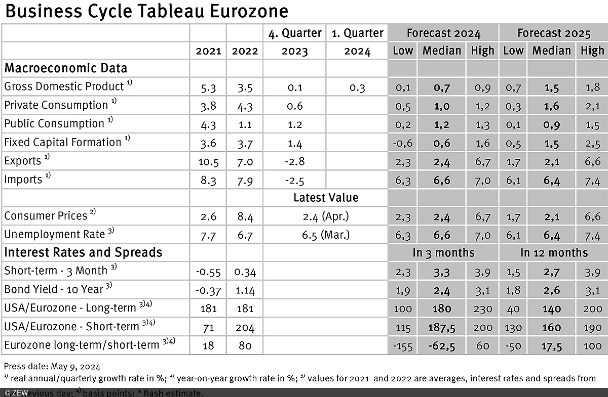In cooperation with Börsen-Zeitung, ZEW has been publishing monthly business cycle tableaus for Germany and the Eurozone with economic key figures and forecasts since 2013. Numerous banks and institutes publish reports on the current and prospective economic situation at different intervals. The information relevant for the tableau is extracted from these publications to compute a median, minimum and maximum of the available forecasts for the current and subsequent year.