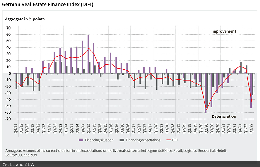 The German Real Estate Finance Index (DIFI) by ZEW Mannheim and JLL slumped significantly in the second quarter of 2022. The index lost 51.7 points compared to the previous quarter and slipped to minus 44.5 points. In the first quarter of 2022, the DIFI had already recorded a decline for the first time in six quarters.