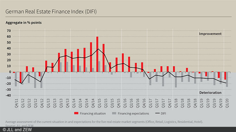 The downward trend of the German Real Estate Financing Index (DIFI) of ZEW and JLL continues in the first quarter of 2020. The index fell 3.7 points to a level of minus 18.9 after the surveyed experts again gave a worse assessment of the financing situation both for the past six months as well as for the coming six months. Only the sub-indicators for stationary retailers show a clear improvement, but still remain in negative territory.