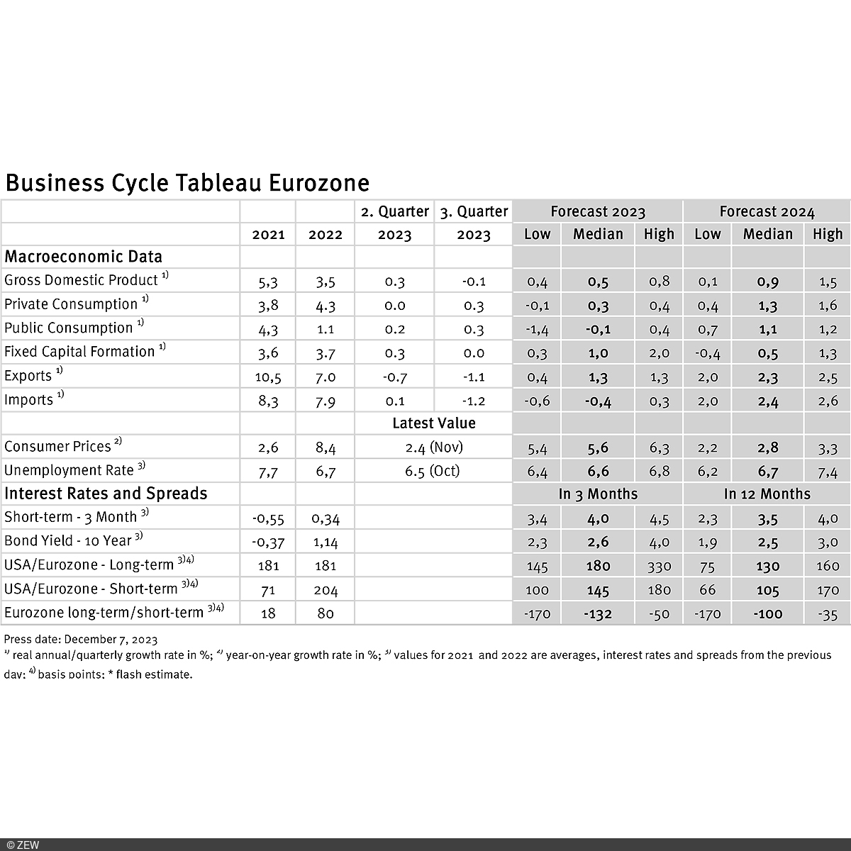 In cooperation with Börsen-Zeitung, ZEW has been publishing monthly business cycle tableaus for Germany and the eurozone with economic key figures and forecasts since 2013. Numerous banks and institutes publish reports on the current and prospective economic situation at different intervals. The information relevant for the tableau is filtered out of these publications to compute a median, minimum and maximum of the available forecasts for the current and subsequent year.