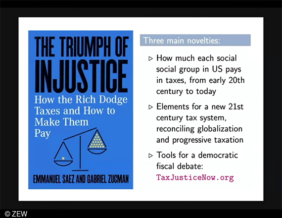 Do all Americans pay a fair amount of tax? Not at all. On the contrary, there is a huge disparity in the taxation of average workers and the taxation of the wealthy, especially the super-rich, according to UC Berkeley Associate Professor Gabriel Zucman. On 10 March 2021, the economist presented his new book ‘The Triumph of Injustice: How the Rich Dodge Taxes and How to Make Them Pay’ virtually at ZEW Mannheim, which he wrote together with Emmanuel Saez. Zucman is also leading the newly established European Tax Observatory that has commenced its work in 2021. ZEW President Professor Achim Wambach moderated the third edition of #ZEWBookTalk.