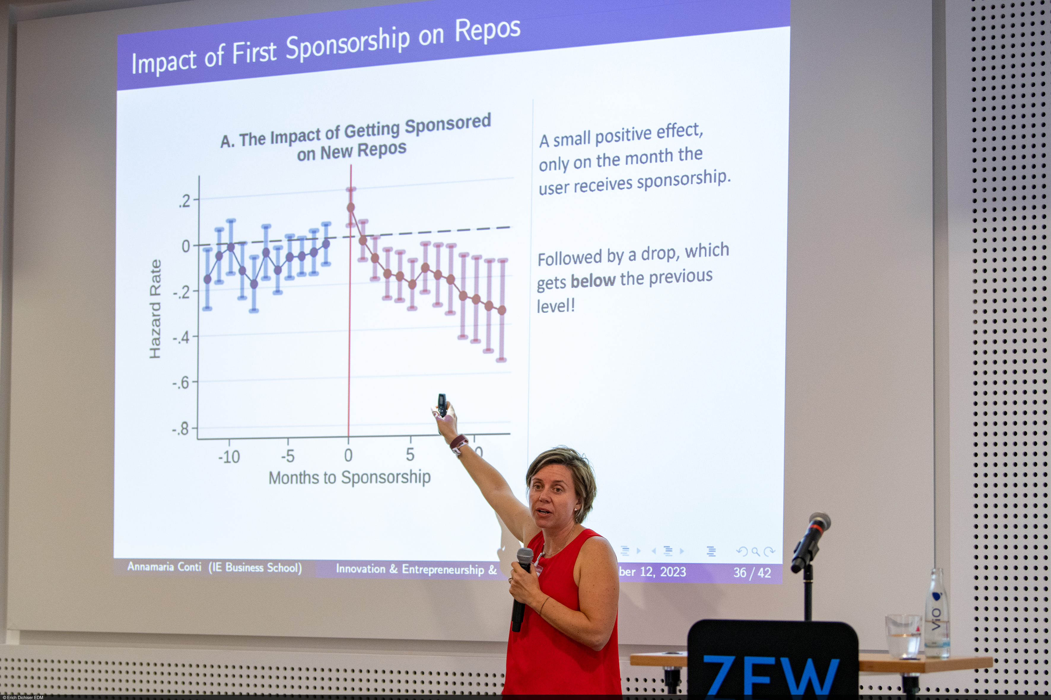 On the first day of the conference, Annamaria Conti, associate professor at the IE Business School in Madrid, delivered a keynote on the significance of open-source platforms for innovation. She presented her analysis of the open-source platform GitHub, where software developers can share their code. Interestingly, financial incentives through a scholarship programme for developers did not lead to an increase in produced code or more innovative contributions.