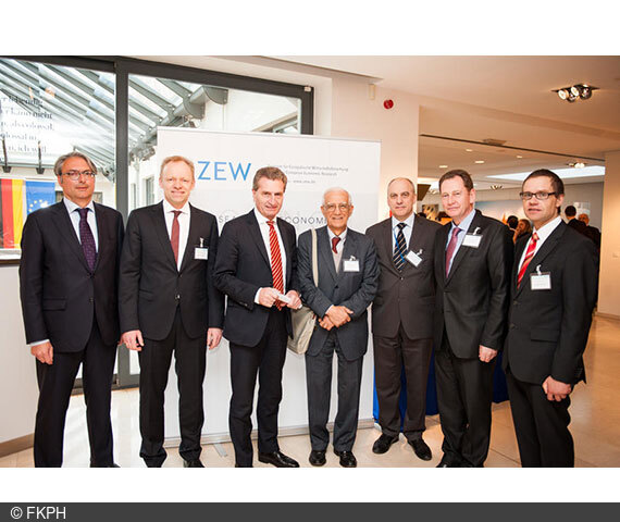 Participants in the first ZEW Lunch Debate: Johannes Jung (Head of the State Representation in Brussels) and ZEW President Prof. Clemens Fuest with EU Commissioner Günther H. Oettinger, Prof. Vittorio Prodi MEP, Jaroslaw Pietras (General Secretariat of the Council, General Director Environment, Education, Transport and Energy), Sir Graham Watson MEP and Thomas Kohl (ZEW Director of Business and Administration)
