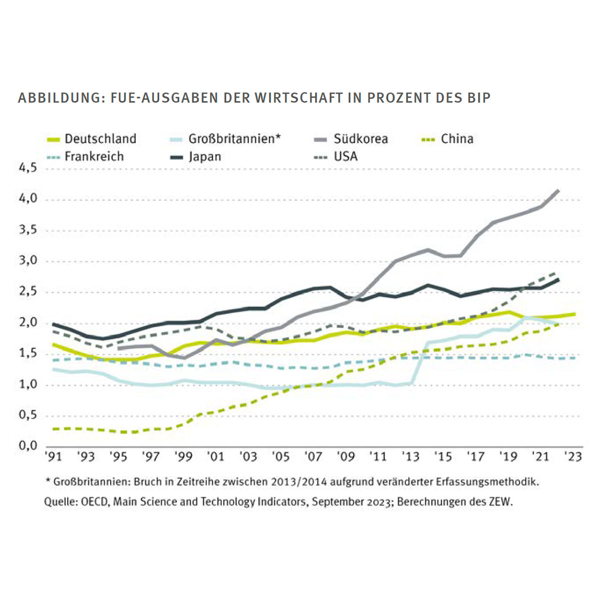 Innovationen sind ein unbestrittener Wachstumstreiber und technologischer Fortschritt eine Grundvoraussetzung für die Sicherung des Wohlstands angesichts wachsender ökologischer und demographischer Herausforderungen. In jüngster Zeit wird jedoch verstärkt auf eine wachsende Innovationslücke zwischen den USA und China auf der einen und Europa auf der anderen Seite hingewiesen. Dies zeigt sich etwa im Bereich der Künstlichen Intelligenz (KI) und davon abgeleiteten Technologien wie autonome Systeme. Hinzu kommt, dass die Investitionen in Forschung und Entwicklung (FuE) in Europa weniger stark steigen als in den USA, China oder auch Südkorea (siehe Abbildung).