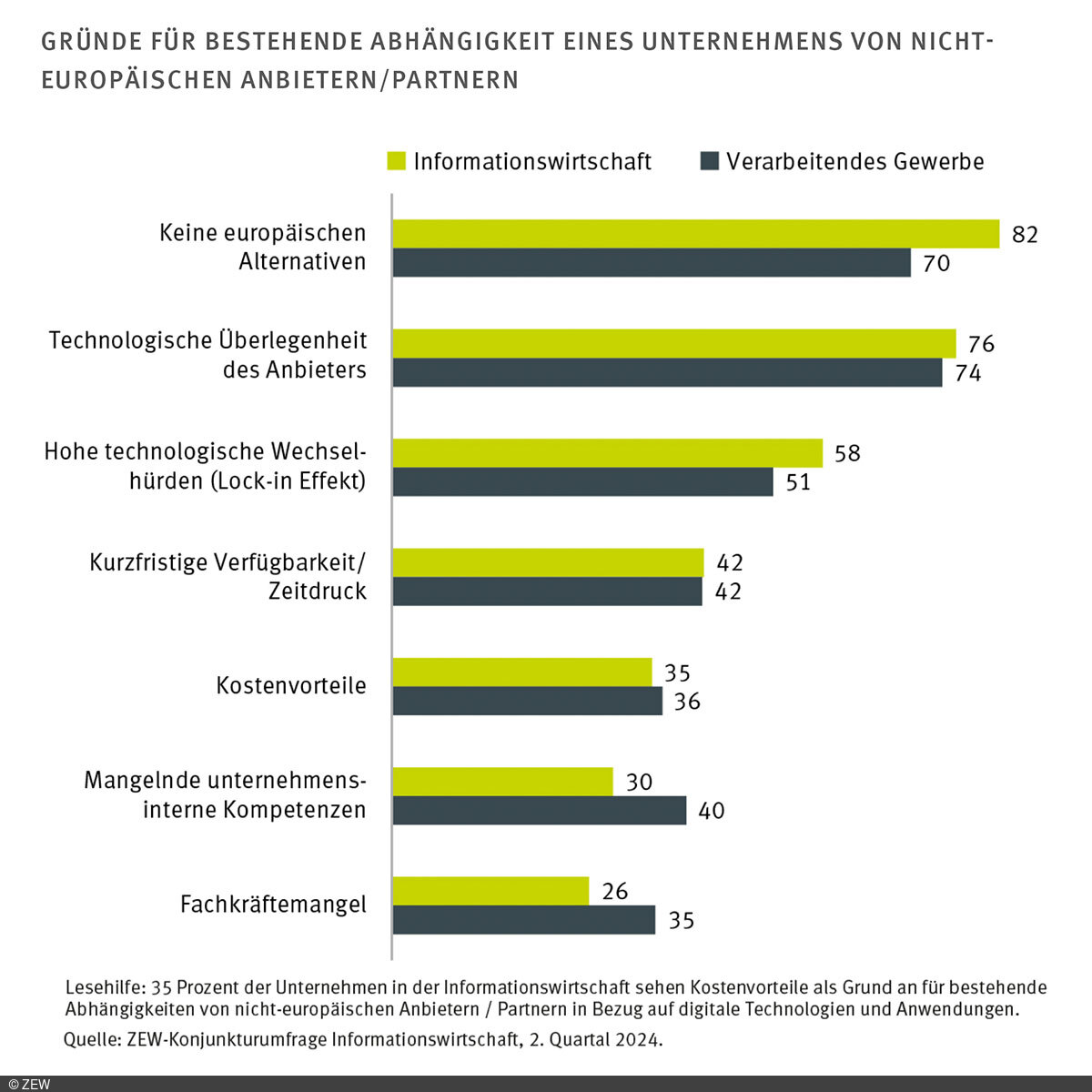 Digitale Technologien gelten als Schlüsseltechnologien, die auch für die Weiterentwicklung anderer Technologiebereiche sowie für zahlreiche Branchen eine wichtige Rolle spielen. Deutschland und die EU weisen deutliche Schwächen bei Entwicklung und Einsatz digitaler Technologien auf. Dies zeigt sich auch bei der Künstlichen Intelligenz (KI), die sich aktuell sehr dynamisch entwickelt. Innovations- und Produktivitätspotenziale durch Digitalisierung bleiben daher ungenutzt, was als ein wesentlicher Grund für die Innovationslücke und Wachstumsschwäche gilt, die Europa und insbesondere Deutschland im Vergleich zu den USA aufweisen. Dabei fühlen sich über 80 Prozent der Unternehmen in Deutschland von außereuropäischen Anbietern digitaler Technologien und Anwendungen abhängig. Als Gründe werden vor allem fehlende europäische Alternativen sowie die technologische Überlegenheit außereuropäischer Anbieter genannt (siehe Grafik). Der Zugang zu digitalen Technologien ohne einseitige Abhängigkeiten und die Kompetenzen, diese Technologien weiterzuentwickeln und anzuwenden, ssind Voraussetzungen eines digital souveränen Europas. Diese gewinnt nicht zuletzt vor dem Hintergrund zunehmender geopolitischer Spannungen an Bedeutung.