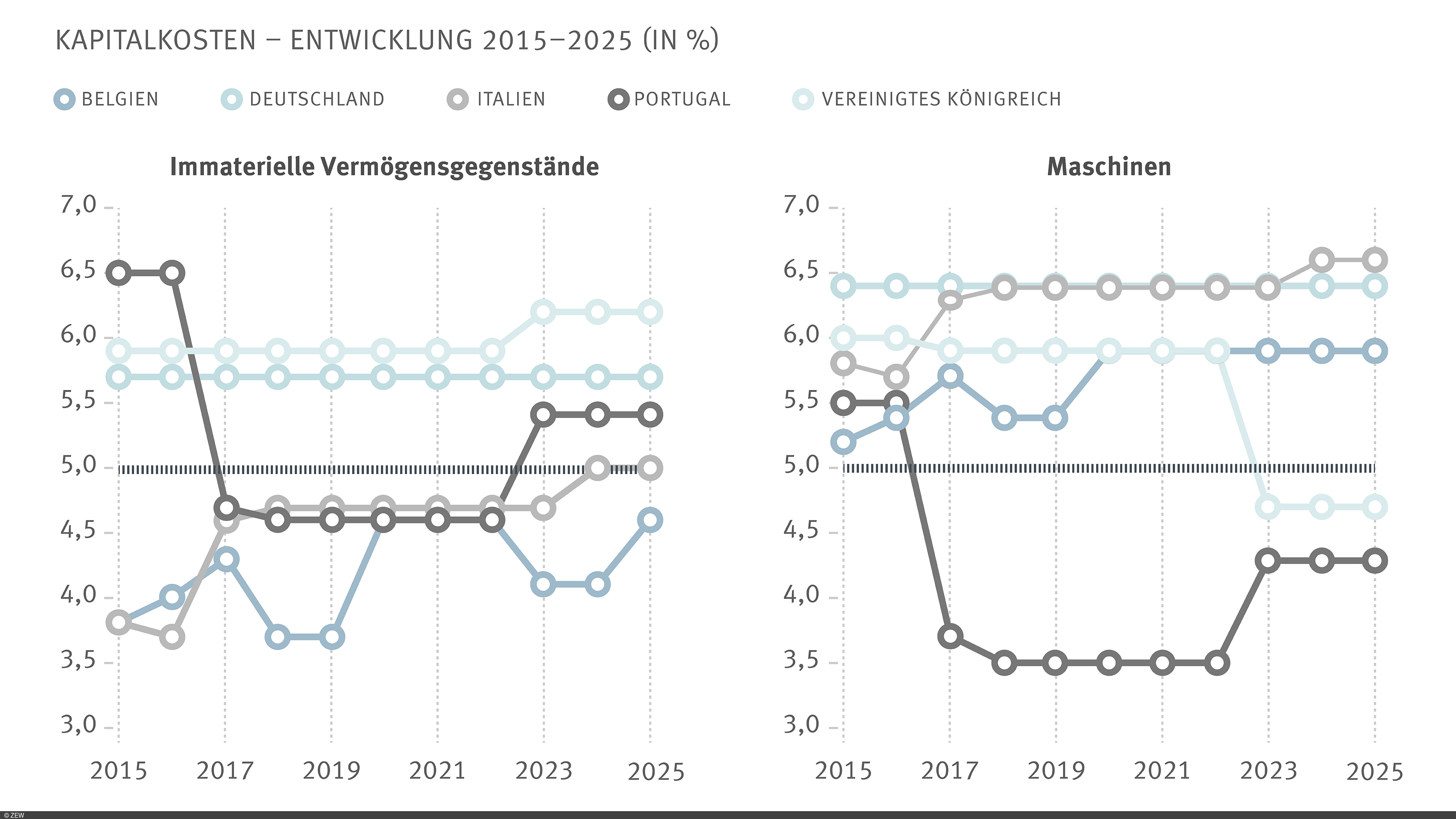 Beim Vergleich verschiedener Hochsteuerländer zeigt sich eine erhebliche Spannbreite der Kapitalkosten, die vor allem auf länderspezifische Investitionsanreize zurückzuführen ist. Diese umfassen insbesondere den fiktiven Zinsabzug auf Eigenkapital (u.a. Belgien bis 2022, Italien bis 2023, Portugal) zur Reduzierung der steuerlichen Verzerrung zwischen Eigen- und Fremdkapital und zunehmend Anreize in Form beschleunigter oder Überanschreibungen. Bei beschleunigten Abschreibungen ergibt sich ein steuerlicher Vorteil aus dem Steuerstundungseffekt. So lagen über die vergangenen zehn Jahre in Italien die Kapitalkosten für erworbene Patente durchschnittlich bei 4,6% und in Portugal die Kapitalkosten für Maschinen bei 4,1%. Auch das Vereinigte Königreich konnte trotz der Erhöhung des Körperschaftsteuersatzes von 19% auf 25% in 2023 durch die zeitgleiche Einführung einer vollständigen Sofortabschreibung für Maschinen die Kapitalkosten auf 4,7% senken. Überdies bestehen in einigen Ländern Möglichkeiten zur Überabschreibung, bei der Beträge oberhalb der tatsächlichen Anschaffungskosten steuerlich geltend gemacht werden können. Belgien erreicht so für erworbene Patente über die vergangenen zehn Jahre Kapitalkosten von durchschnittlich 4,2%. Gleichzeitig führen diese Regelungen zu Verzerrungen zwischen verschiedenen Wirtschaftsgütern: In Belgien und Italien werden immaterielle Wirtschaftsgüter deutlich stärker begünstigt als materielle, während in Portugal und in Großbritannien der umgekehrte Fall gilt. Solche Unterschiede können zu unerwünschten Fehlanreizen und Marktverzerrungen führen.