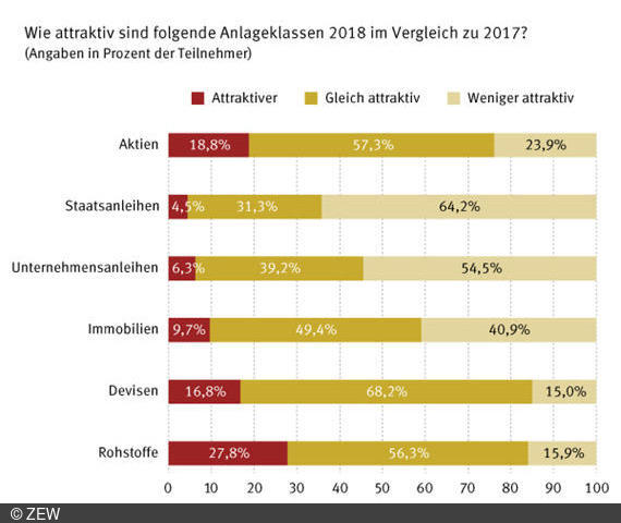 Die Finanzmarktexperten/-innen wurden befragt, in welchen Anlageklassen sie eine lohnenswerte Investitionsmöglichkeit für das kommende Jahr sehen. Für die wichtigsten Anlageklassen gaben sie an, ob sie diese 2018 im Vergleich zu 2017 für attraktiver, gleich attraktiv oder weniger attraktiv halten.