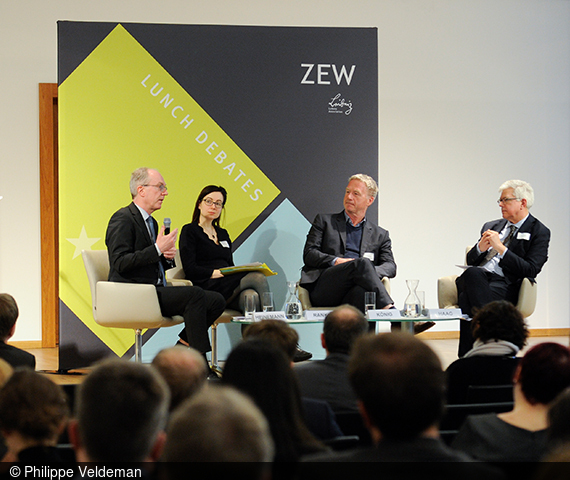 ZEW-Ökonom Prof. Dr. Friedrich Heinemann, Moderatorin Jennifer Rankin, Politikwissenschaftler Prof. Dr. König und Marcel Haag von der Europäischen Kommission (v.l.) diskutierten bei der ZEW Lunch Debate über die institutionelle Ausgestaltung der EU.