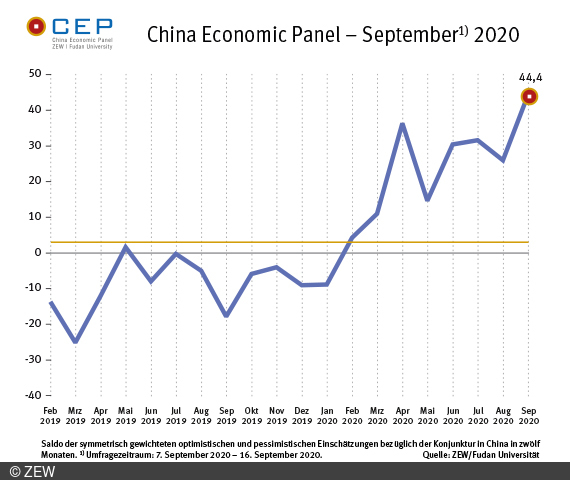 In der aktuellen September-Umfrage (07.09. – 16.09.2020) steigt der CEP-Indikator um 18,3 Punkte auf 44,4 Punkte. Dies ist mit Abstand der höchste Wert des Indikators seit Beginn der Umfrage Mitte 2013. Der CEP-Indikator, der auf Basis des China Economic Panel (CEP) in Kooperation mit der Fudan Universität, Shanghai, erhoben wird, gibt die Konjunkturerwartungen internationaler Finanzmarktexpertinnen und Finanzmarktexperten für China auf Sicht von zwölf Monaten wieder.