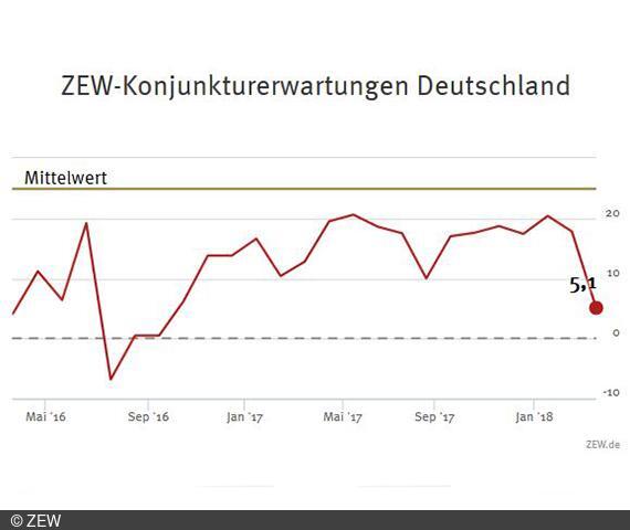 Die ZEW-Konjunkturerwartungen für Deutschland gehen im März 2018 deutlich zurück. Der Index verliert gegenüber dem Vormonat 12,7 Punkte und steht nun bei 5,1 Punkten (langfristiger Mittelwert: 23,6 Punkte). Der Anteil der Experten/-innen, die eine Verschlechterung in den kommenden sechs Monaten erwarten, steigt um 7,2 Prozent auf 12,9 Prozent.