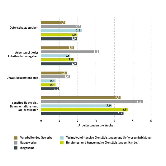 Junge Unternehmen verbringen im Durchschnitt etwa neun Stunden pro Woche mit gesetzlich vorgegeben administrativen Aufgaben. Dabei handelt es sich um datenschutzrechtliche, arbeitsrechtliche bzw. arbeitsschutzrechtliche Vorgaben, Umweltschutznormen sowie sonstige Nachweis-, Dokumentations- und Meldepflichten. Die Unternehmen des Baugewerbes geben hier im Vergleich zu anderen Branchen eine überdurchschnittliche Bürokratiebelastung an.