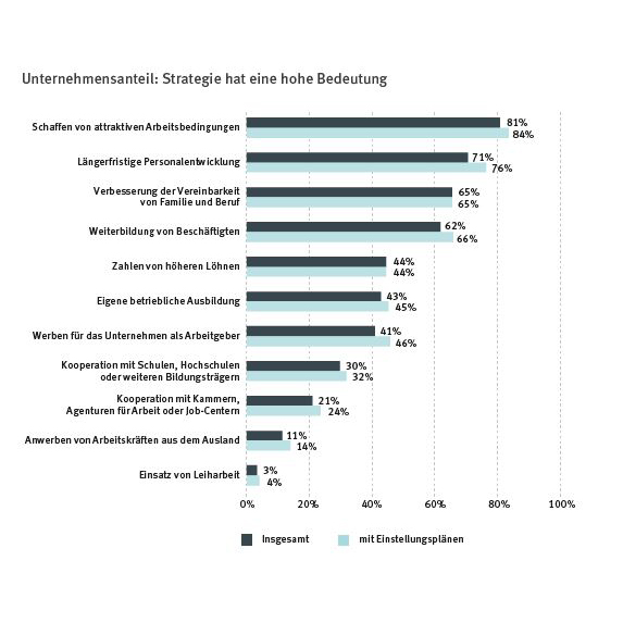 Mehr als 80 Prozent der jungen Unternehmen messen attraktiven Arbeitsbedingungen eine hohe Bedeutung bei, um Fachkräfte im Unternehmen halten zu können. Eine langfristige Personalentwicklung wird von einem Großteil der jungen Unternehmen als wichtige Strategie angesehen. Auch die Verbesserung der Vereinbarkeit von Familie und Beruf sowie Weiterbildung sind für mehr als die Hälfte der Unternehmen von großer Bedeutung, um die Arbeitnehmer/innen zufrieden zu stellen. Etwa 40 bis 45 Prozent nennen die Zahlung höherer Löhne, die eigene betriebliche Ausbildung sowie die aktive Werbung für das Unternehmen als Arbeitgeber als Strategien. Kooperationen mit Bildungsträgern, IHKs und Jobcentern werden als weniger wichtig angesehen. „Dies deutet darauf hin, dass junge Unternehmen weniger auf institutionelle Unterstützung setzen, sondern eher die Eigeninitiative ergreifen“, so Gottschalk.