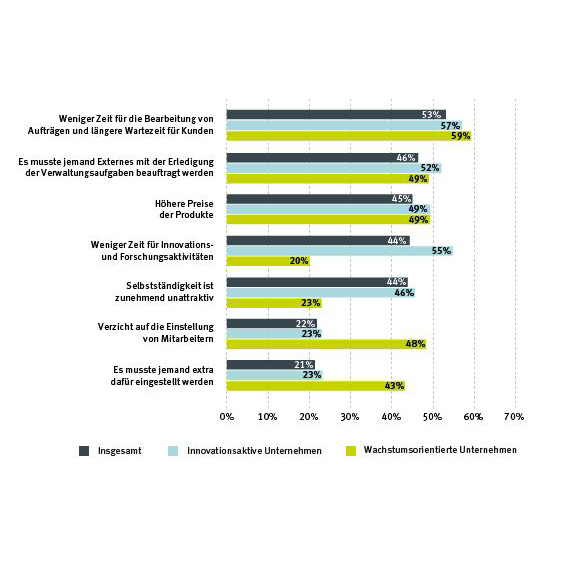 Mehr als die Hälfte der befragten Unternehmen gab an, dass aufgrund der bürokratischen Anforderungen weniger Zeit für die Bearbeitung von Aufträgen bliebe und dies zu längeren Wartezeiten für Kundinnen und Kunden führe. Am zweithäufigsten wurde der Aussage zugestimmt, dass für die Erledigung der administrativen Aufgaben eine externe Person eingesetzt wird. 45 Prozent der befragten Unternehmen gaben zudem an, dass sie die Preise für ihre Produkte erhöhen mussten. 44 Prozent gaben an, weniger Zeit für Innovation und Forschung zu haben und bewerteten die Selbstständigkeit aufgrund des bürokratischen Aufwands als zunehmend unattraktiv. Etwas mehr als ein Fünftel der Unternehmen hat aufgrund der Bürokratie auf Neueinstellungen verzichtet und wiederum ein Fünftel gab an, eigens für die Bewältigung der administrativen Aufgaben Personal eingestellt zu haben.
