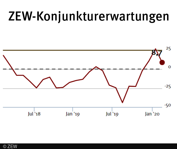 Die ZEW-Konjunkturerwartungen für Deutschland gehen im Februar um 18,0 Punkte zurück. Mit einem Wert von 8,7 Punkten liegen sie leicht unter dem Stand von Dezember 2019. Die Einschätzung der konjunkturellen Lage für Deutschland hat sich ebenfalls gegenüber dem Vormonat verschlechtert. In der aktuellen Umfrage liegt der Lageindikator bei minus 15,7 Punkten und damit 6,2 Punkte unterhalb des Wertes vom Januar.