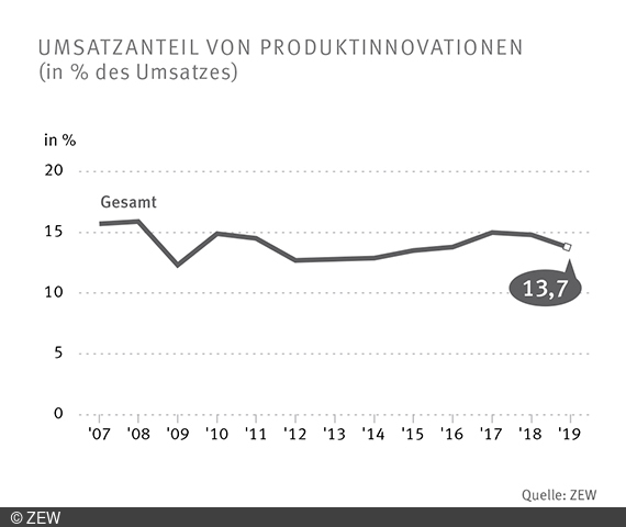 Die Innovationserfolge der deutschen Wirtschaft blieben im Jahr 2019 unter den Vorjahreswerten. Der Umsatz, der mit Produktinnovationen erzielt wurde, ging um 6,4 Prozent auf 744 Milliarden Euro zurück. Dies entspricht 13,7 Prozent des gesamten Umsatzes der Unternehmen im Berichtskreis der Innovationserhebung. Der Umsatz mit Marktneuheiten, also mit Produktinnovationen, die zuvor noch nicht in gleicher oder ähnlicher Form im Markt angeboten wurden, sank um 12,2 Prozent auf 156 Milliarden Euro (2,9 Prozent des gesamten Umsatzes). Den höchsten Umsatzanteil von Produktinnovationen wies der Fahrzeugbau auf (45 Prozent), der auch beim Umsatzanteil von Marktneuheiten mit 10,9 Prozent vorne liegt. Prozessinnovationen trugen 2019 zu Kostensenkungen im Ausmaß von 3,0 Prozent der gesamten Kosten der Unternehmen im Berichtskreis der Innovationserhebung bei. Dies ist etwas weniger als im Vorjahr (3,5 Prozent).