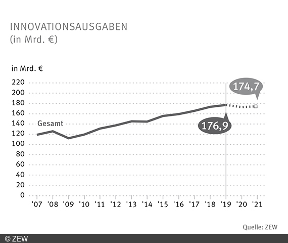 Für 2021 sind die Planzahlen von sehr hoher Unsicherheit geprägt. Mit Stand Mitte 2020 zeichnete sich ein leichter Zuwachs um 0,9 Prozent auf knapp 175 Milliarden Euro ab. Wiederum sind es die Großunternehmen, die optimistischer in die Zukunft blicken (plus zwei Prozent), während die KMU ihre Innovationsbudgets auch 2021 zurücknehmen wollen (minus fünf Prozent).