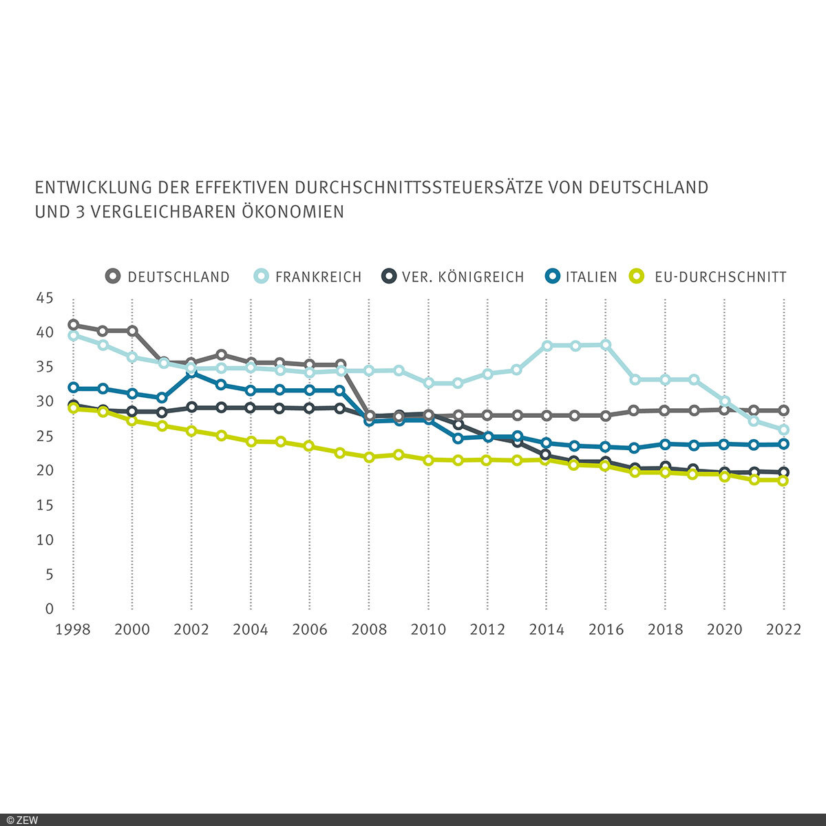 Der aktuelle Mannheim Tax Index vom ZEW Mannheim zeigt, dass Deutschland im internationalen Steuerwettbewerb weiter an Boden verloren hat. Dies wird insbesondere durch die Senkung des französischen Körperschaftsteuersatzes in den letzten Jahren deutlich: Die Unternehmenssteuerbelastung in Deutschland ist nun im unmittelbaren Vergleich mit wichtigen Wettbewerbern am höchsten. Die effektive Durchschnittssteuerbelastung eines profitablen Investitionsprojekts in Deutschland liegt im Jahr 2022 bei 28,8 Prozent und übersteigt somit den EU-Durchschnitt um 10 Prozentpunkte.