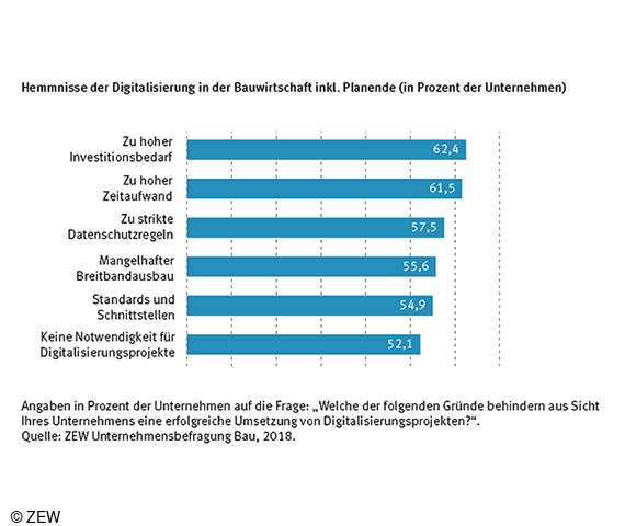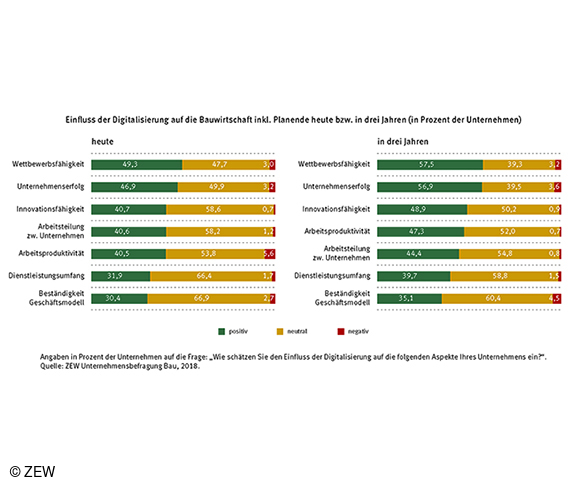Zu diesen Ergebnissen kommt die Studie „Zukunft Bau - Beitrag der Digitalisierung zur Produktivität in der Baubranche“, die das ZEW Mannheim im Auftrag des Bundesinstituts für Bau-, Stadt- und Raumforschung (BBSR) erstellt hat und heute anlässlich der gemeinsamen Abschlussveranstaltung von ZEW, BBSR und dem Mittelstand 4.0-Kompetenzzentrum Planen und Bauen in Berlin präsentiert.