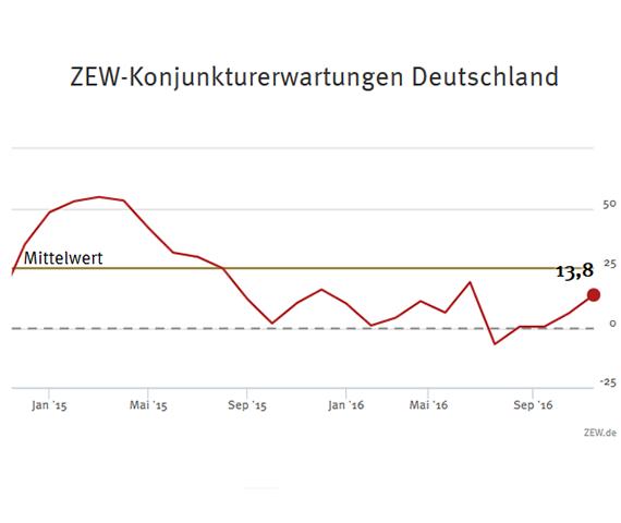 ZEW-KonjunkturerwartungenDie ZEW-Konjunkturerwartungen für Deutschland steigen im November 2016 kräftig an. Der Index liegt bei 13,8 Punkten (langfristiger Mittelwert: 24,0 Punkte), 7,6 Punkte mehr als im Oktober. "Die ZEW-Konjunkturerwartungen sind zum vierten Mal in Folge gestiegen, begünstigt durch positive Konjunkturzahlen aus den USA und China. Der erneute Anstieg weist damit auf ein höheres Wirtschaftswachstum in den nächsten sechs Monaten hin. Die von der Wahl Donald Trumps zum US-Präsidenten ausgehenden politischen und wirtschaftlichen Unsicherheiten machten sich jedoch durchaus bemerkbar. Die gemeldeten Konjunkturerwartungen nach der Wahl waren weniger positiv als zuvor", so ZEW-Präsident Prof. Achim Wambach, PhD.