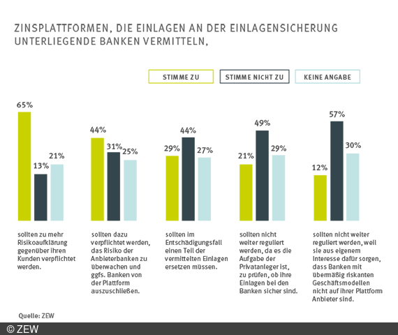 65 Prozent der befragten Finanzexperten/-innen wollen Zinsplattformen, denen eine Schlüsselposition bei der Vermittlung riskanterer Einlagenangebote zukommt, zu mehr Risikoaufklärung gegenüber ihren Kunden verpflichten. Dass diese aus eigenem Interesse dafür sorgen, dass Anbieter mit übermäßig riskantem Geschäftsmodell nicht auf ihrer Plattform vertreten sind, ziehen 57 Prozent der Befragten in Zweifel. Eine Mehrheit von 44 Prozent lehnt jedoch ab, dass Zinsplattformen im Entschädigungsfall einen Teil der vermittelten Einlagen ersetzen müssen.