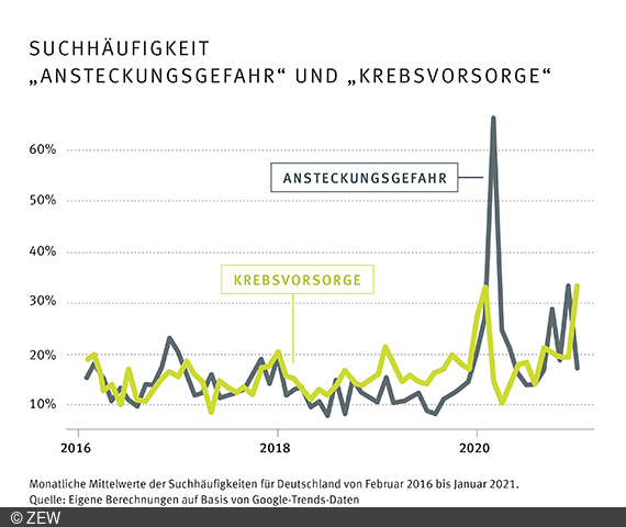 In einer Auswertung aktueller internationaler Studien sowie von Google-Trends-Daten zeigen Simon Reif und die ZEW-Ökonomin Sabrina Schubert, dass insbesondere in Phasen mit hohen Corona-Infektionszahlen die Nachfrage nach Vorsorgeuntersuchungen zurückgeht. Dieser Zusammenhang findet sich bei mehreren Studien aus Deutschland, den USA und Großbritannien. Zusätzlich lässt sich anhand der Häufigkeit von Google Suchanfragen zeigen, dass im vergangenen Jahr in Deutschland die Suchhäufigkeit nach „Krebsvorsorge“ immer dann niedrig war, wenn die Suchhäufigkeit nach „Ansteckungsgefahr“ hoch war.