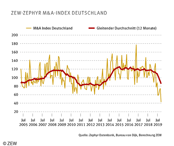 Die Anzahl der Übernahmen und Fusionen (Mergers & Acquisitions, M&A) mit deutscher Beteiligung ist seit Anfang des Jahres 2019 regelrecht eingebrochen. Die Monate April und Mai 2019 erwiesen sich dabei als besonders schwach. Im April 2019 fiel der ZEW-ZEPHYR M&A-Index auf einen historischen Tiefstand von 58 Punkten, nur um im Mai mit 60 Punkten den zweitschlechtesten Wert seit Beginn der Aufzeichnung zu erreichen.