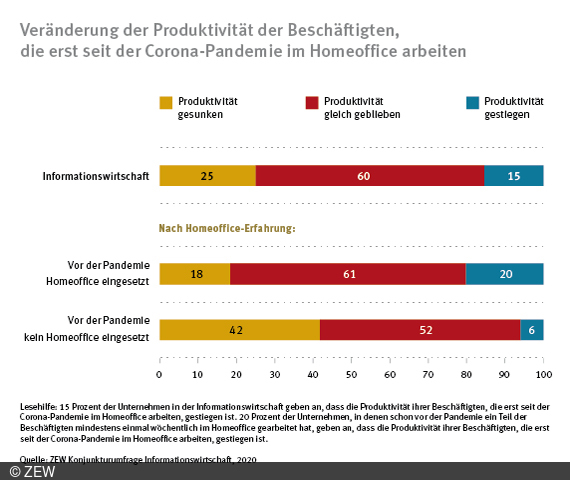 „Zudem beobachtet die Mehrheit der Unternehmen in den letzten Monaten keinen Produktivitätsverlust durch Homeoffice. So berichten drei Viertel der Unternehmen in der Informationswirtschaft von einer konstanten oder sogar gestiegenen Produktivität der Beschäftigten, die seit Beginn der Corona-Pandemie erstmals im Homeoffice arbeiten.“ Zu diesen Ergebnissen kommt eine repräsentative Umfrage unter rund 850 Unternehmen der Informationswirtschaft, die das ZEW Mannheim im Dezember 2020 durchgeführt hat.