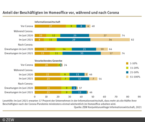 Neben den langfristigen Erwartungen ist auch die aktuelle Nutzung von Homeoffice im Vergleich zum Juni 2020 gestiegen. In der Informationswirtschaft arbeitet nun in 63 Prozent der Unternehmen mehr als ein Fünftel der Beschäftigten regelmäßig im Homeoffice. Im Verarbeitenden Gewerbe beläuft sich dieser Anteil auf etwa 24 Prozent der Unternehmen.