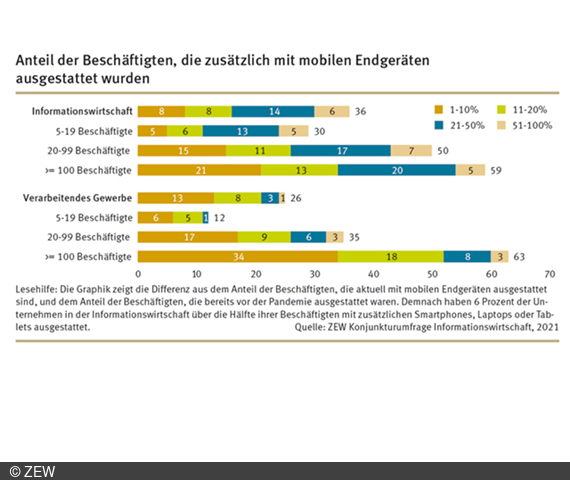 Für die Verlagerung der Arbeit ins Homeoffice haben sowohl die Unternehmen als auch die Mitarbeiterinnen und Mitarbeiter in technische Ausstattung und Infrastruktur investiert. Ein wichtiger Bestandteil solcher Investitionen waren dabei digitale Endgeräte wie Smartphones, Notebooks oder Tablets. Die Mehrheit der Unternehmen in der Informationswirtschaft (82 Prozent) und im Verarbeitenden Gewerbe (70 Prozent) hatte zwar bereits vor der Pandemie einen Teil ihrer Beschäftigten mit diesen Endgeräten ausgestattet, im Verlauf der Corona-Pandemie haben die Unternehmen diesen Anteil allerding deutlich ausgeweitet. Insgesamt jedes dritte Unternehmen in der Informationswirtschaft und jedes vierte Unternehmen im Verarbeitenden Gewerbe hat zusätzliche Endgeräte bereitgestellt. Mit einem Anteil von etwa 60 Prozent haben insbesondere größere Unternehmen mit mindestens 100 Beschäftigten die Ausstattung mit mobilen Endgeräten aufgestockt. Dabei wurde in der Informationswirtschaft allerdings ein deutlich höherer Anteil an Beschäftigten zusätzlich ausgestattet als im Verarbeitenden Gewerbe. So hat etwa jedes vierte Unternehmen in der Informationswirtschaft mehr als 20 Prozent der Beschäftigten im Zuge der Corona-Pandemie zusätzlich mit digitalen Endgeräten ausgestattet, während dies nur auf rund jedes zehnte Unternehmen im Verarbeitenden Gewerbe zutrifft.