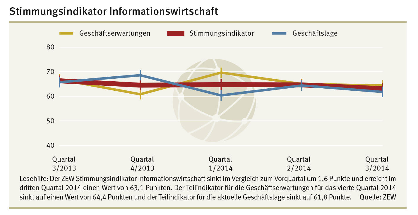 InformationswirtschaftIm dritten Quartal 2014 ist die konjunkturelle Stimmung bei den Unternehmen der Informationswirtschaft weiter positiv. Der ZEW Stimmungsindikator Informationswirtschaft verliert zwar im Vergleich zum Vorquartal 1,6 Punkte, signalisiert mit seinem hohen Niveau von 63,1 Punkten aber weiterhin eine günstige wirtschaftliche Entwicklung für die Branche.
