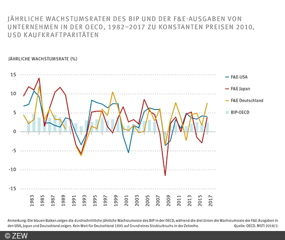 Während die meisten Unternehmen in Deutschland ihre FuE-Ausgaben am Wirtschaftszyklus ausrichten und damit in der Rezession herunterfahren, haben etwa 34 Prozent aller deutschen Unternehmen ihre Innovationsaktivitäten in der Finanzkrise 2008/2009 antizyklisch erhöht. Die Folgen der damaligen Rezession wurden von innovativen Unternehmen in Europa wesentlich besser verkraftet, so mussten sie beispielsweise weniger Stellen streichen als Unternehmen, die nicht oder kaum innovieren.