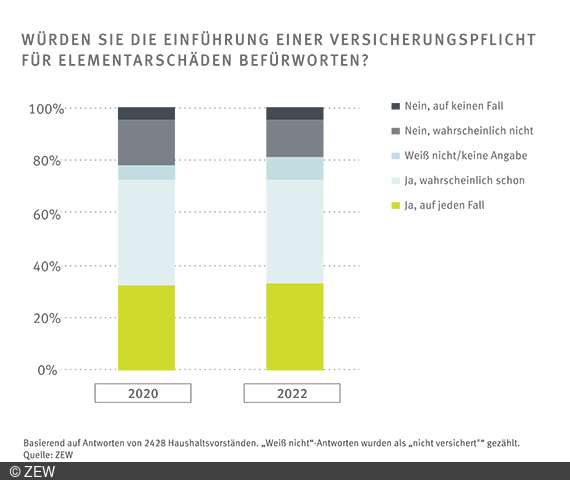 Mehr als zwei Drittel der deutschen Haushalte befürworten die Einführung einer Versicherungspflicht gegen Hochwasser und andere Elementarschäden. Die Zustimmung ist nach der Hochwasserkatastrophe im Jahr 2021 zudem leicht gestiegen. Das zeigt eine repräsentative Erhebung des ZEW Mannheim. Hierfür wurden rund 5.000 Haushalte im Jahr 2020 und im Jahr 2022 befragt.