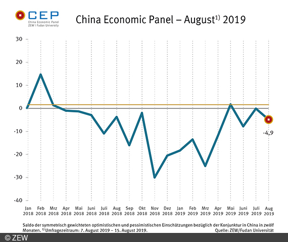 In der aktuellen August-Umfrage (7.8. – 15.8.2019) sind die Konjunkturerwartungen für China um 4,8 Punkte gesunken. Der Wert des CEP-Indikators, der auf Basis des China Economic Panel (CEP) erhoben wird und die Konjunkturerwartungen internationaler Finanzmarktexperten/-innen für China auf Sicht von zwölf Monaten wiedergibt, liegt damit aktuell bei minus 4,9 Punkten (Juli 2019: minus 0,1 Punkte). Der CEP-Indikator befindet sich nun seit März 2018 unterhalb des langfristigen Durchschnitts von 1,5 Punkten und seit April 2018 praktisch ununterbrochen unterhalb der Null-Linie.