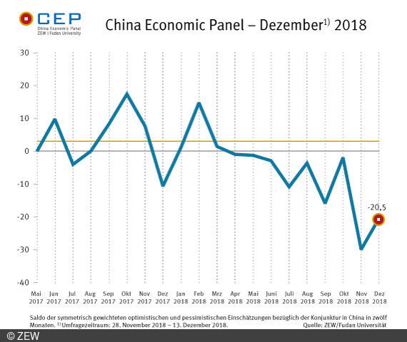 China Economic PanelIn der aktuellen Umfrage von Dezember (28.11. – 13.12.2018) erholen sich die Konjunkturerwartungen für China zwar wieder, bleiben mit minus 20,5 Punkten aber weiterhin deutlich im negativen Bereich. Der CEP-Indikator, der die Konjunkturerwartungen internationaler Finanzmarktexperten/-innen für China auf Sicht von zwölf Monaten wiedergibt, deutet damit trotz des aktuellen Anstiegs um 9,5 Punkte im Vergleich zum Vormonat (November 2018: minus 30,0 Punkte) weiter auf einen wirtschaftlichen Abschwung hin. Der langfristige Durchschnitt von 3,0 Punkten wird seit März 2018 ununterbrochen und seit einigen Monaten auch sehr deutlich unterschritten.