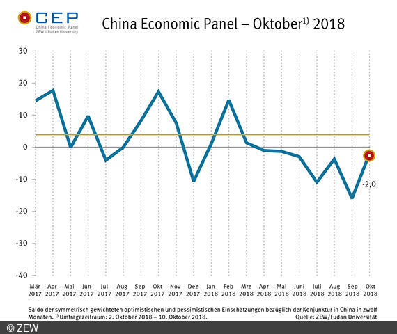 China Economic PanelIn der aktuellen Umfrage von Oktober (02. – 17.10.2018) steigen die Konjunkturerwartungen für China wieder. Der CEP-Indikator, der die Konjunkturerwartungen internationaler Finanzmarktexperten/-innen für China auf Sicht von zwölf Monaten wiedergibt, legt um 14 Punkte auf einen aktuellen Wert von minus 2,0 Punkten zu (September 2018: minus 16,0 Punkte). Der langfristige Durchschnitt von 3,9 Punkten wird damit abermals deutlich unterschritten. Die Konjunktursituation Chinas wird mit einem Saldo von minus 3,9 Punkten um 5,7 Punkte schlechter eingeschätzt als im Vormonat.