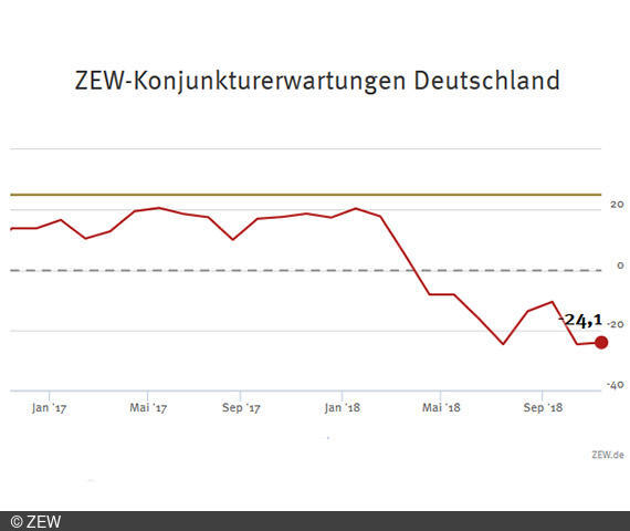 ZEW-KonjunkturerwartungenDie ZEW-Konjunkturerwartungen für Deutschland sind im November 2018 um 0,6 Punkte auf einen neuen Wert von minus 24,1 Punkten angestiegen. Der Indikator hat sich damit zwar geringfügig verbessert, befindet sich aber nach wie vor sehr deutlich im negativen Bereich und unterhalb seines langfristigen Durchschnitts von 22,7 Punkten. Die Bewertung der aktuellen konjunkturellen Lage für Deutschland hat sich im November ganz erheblich verschlechtert. Sie fällt um 11,9 Punkte auf einen aktuellen Wert von 58,2 Punkten.