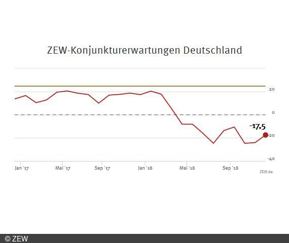 Die ZEW-Konjunkturerwartungen für Deutschland steigen im Dezember 2018 um 6,6 Punkte auf einen neuen Wert von minus 17,5 Punkten an. Die Konjunkturerwartungen sind trotz dieser Verbesserung weiterhin negativ und erheblich unterhalb des langfristigen Durchschnitts von 22,5 Punkten. Die Bewertung der aktuellen konjunkturellen Lage für Deutschland hat sich im Dezember weiter deutlich verschlechtert. Sie fällt um 12,9 Punkte auf einen Wert von 45,3 Punkten.