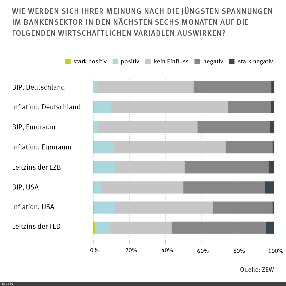 Die Auswirkungen der Unruhen im Bankensektor werden als kurzfristig und moderat eingeschätzt. Insgesamt erwarten die Finanzmarktexpertinnen und -experten auf Sicht von sechs Monaten leicht negative Auswirkungen und auf Sicht von zwei Jahren keine Folgen für Deutschland, den Euroraum und die USA. Das sind die Ergebnisse der Sonderfrage im ZEW-Finanzmarkttest vom April 2023. 172 Finanzmarktexpertinnen und -experten wurden von Forschern des ZEW Mannheim nach kurz- und langfristigen Auswirkungen der aktuellen Krise im Bankensektor befragt.