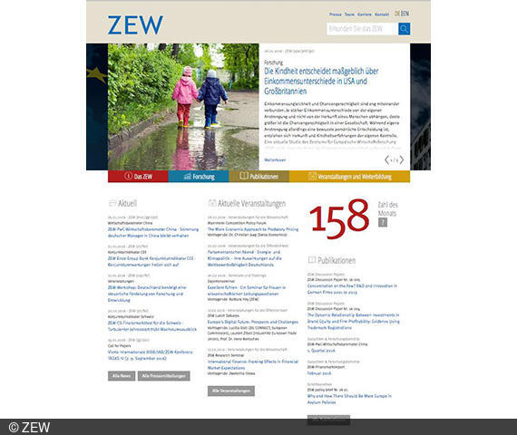 Termine und NachrichtenDer neue Webauftritt des Zentrums für Europäische Wirtschaftsforschung (ZEW) ist seit dem 25. Januar 2016 unter www.zew.de erreichbar. Der Relaunch der ZEW-Webseite konnte somit nach mehrmonatiger intensiver Arbeit erfolgreich abgeschlossen werden. Besonderes Augenmerk galt einer übersichtlichen Darstellung der umfangreichen Aktivitäten des internationalen Wirtschaftsforschungsinstituts – sowohl auf dem Gebiet von Forschung und wirtschaftspolitischer Beratung als auch bei Wissenstransfer, Veranstaltungen und Weiterbildung. Vor dem Hintergrund einer immer professionelleren Wissenschaftskommunikation stellt die neue Online-Präsenz einen zentralen Pfeiler der Kommunikationsstrategie des ZEW dar.