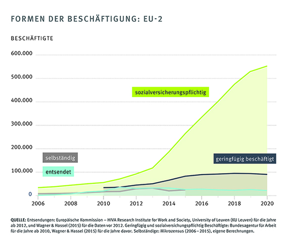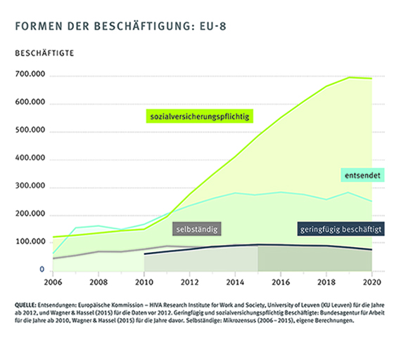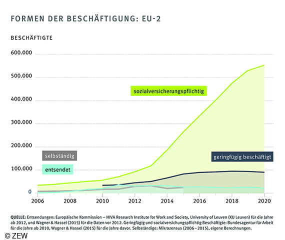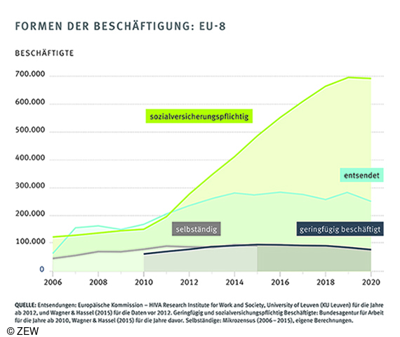 Seit Inkrafttreten der Arbeitnehmerfreizügigkeit aus den neuen EU-Mitgliedsstaaten in 2011 ist ein starker Anstieg dieser sozialversicherungspflichtig Beschäftigten in Deutschland erkennbar. Insgesamt wuchs der Anteil ausländischer sozialversicherungspflichtig Beschäftigter auf 12,9 Prozent in 2020 an. Dabei kamen im Mittel jährlich knapp 107.000 Personen aus den sogenannten EU-8 und EU-2 nach Deutschland. Das sind Polen, Estland, Lettland, Litauen, Slowakei, Slowenien, Tschechien und Ungarn (EU-8), hinzukommen Rumänien und Bulgarien (EU-2). Insgesamt kamen nach den EU-Osterweiterungen stetig mehr Osteuropäer/innen nach Deutschland mit einem Höhepunkt von rund 1,3 Millionen Beschäftigten in 2020. „Das Beschäftigungswachstum ist stark durch voll sozialversicherungspflichtig Beschäftigte aus Osteuropa getrieben und nicht durch Minijobber. Osteuropäerinnen und –europäer zahlen also in die deutschen Sozialkassen ein und erwerben entsprechende Ansprüche“, sagt Dr. Katrin Sommerfeld, Leiterin der ZEW-Nachwuchsforschungsgruppe „Integration von Migranten/-innen und Einstellungen zum Sozialstaat (IMES)“ und Ko-Autorin. Andere Beschäftigungsformen wie Entsendungen, geringfügige Beschäftigung und Selbstständigkeit stagnieren seit Jahren auf einem deutlich niedrigeren Niveau. Der Anteil der Minijobber/innen sank von einem knappen Viertel auf nur noch acht Prozent (EU-8) bzw. neun Prozent (EU-2), rund 90.000 Beschäftigte in den letzten Jahren. Für die EU-8-Länder sind zudem Entsendungen die zweite wichtige Beschäftigungsform, die sich seit 2011 bei rund 250.000 Entsendungen eingependelt hat.