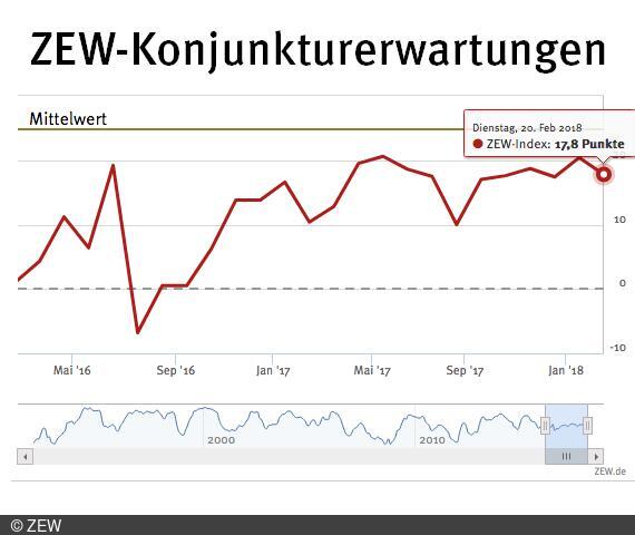 ZEW-KonjunkturerwartungenDie ZEW-Konjunkturerwartungen für Deutschland sind im Februar 2018 um 2,6 Punkte gesunken. Der Indikator beträgt somit aktuell 17,8 Punkte. Der langfristige Durchschnitt liegt bei 23,7 Punkten und wird weiterhin leicht unterschritten. Die Bewertung der aktuellen konjunkturellen Lage für Deutschland ist um 2,9 Punkte auf einen neuen Indexwert von 92,3 Punkten zurückgegangen.