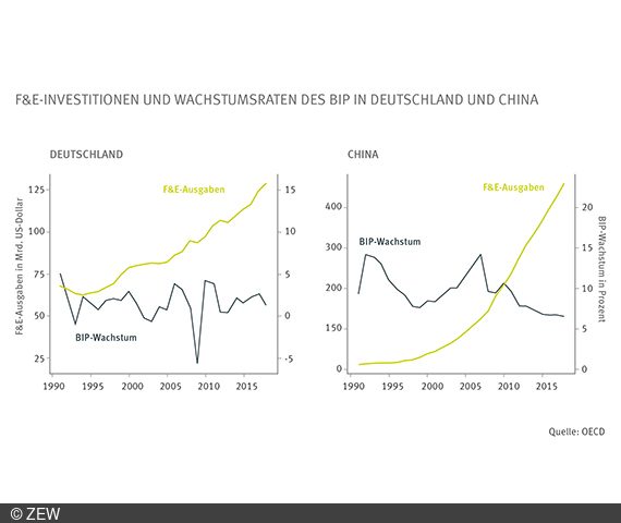 Die Ausgaben für Forschung und Entwicklung (F&E) sind sowohl in Deutschland als auch in China in den vergangenen Jahren deutlich gestiegen. Das Wachstum in beiden Ländern hat davon allerdings weniger profitiert als erwartet. „Dies deutet auf eine zu geringe Forschungsproduktivität in beiden Volkswirtschaften hin“, erklärt Dr. Philipp Böing, Senior Researcher und China-Experte am ZEW Mannheim. In einem heute veröffentlichten ZEW policy brief haben er und Paul Hünermund, PhD, Assistenzprofessor an der Copenhagen Business School, analysiert, wie Investitionen in F&E mit der Forschungsproduktivität in Deutschland und China zusammenhängen. Ihre Schlussfolgerung, um anhaltende Wachstumsraten in Europa zu erzielen: „Erforderlich ist eine Innovationspolitik, die einen Bottom-up-Ansatz verfolgt, und nicht zu stark auf missionsgetriebene Forschungspolitik setzt. Nur auf diesem Weg lassen sich im Wettbewerb mit den führenden Industriestaaten dieser Welt bahnbrechende Innovationen erzielen. Die stark missionsgetriebene Innovationspolitik Chinas kann hier kein Vorbild sein.“