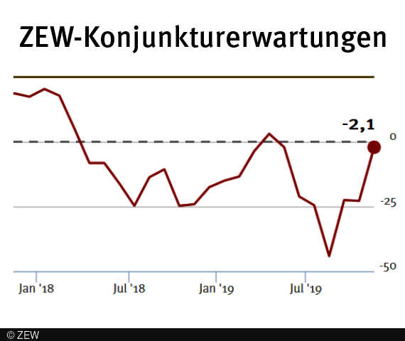 Die ZEW-Konjunkturerwartungen für Deutschland steigen im November 2019 sehr stark an. Der neue Wert der Konjunkturerwartungen liegt bei minus 2,1 Punkten und ist damit 20,7 Punkte höher als im Vormonat. In der aktuellen Umfrage hat sich die Einschätzung der konjunkturellen Lage für Deutschland um 0,6 Punkte erneut leicht verbessert. Der neue Wert des Lageindikators beträgt minus 24,7 Punkte.