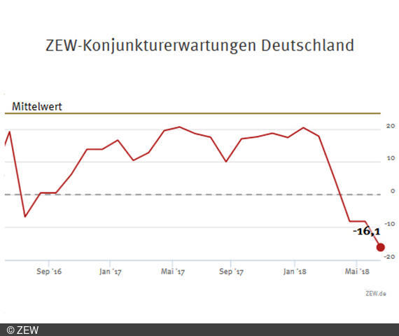 ZEW-KonjunkturerwartungenDie ZEW-Konjunkturerwartungen für Deutschland sind im Juni 2018 um 7,9 Punkte auf einen neuen Wert von minus 16,1 Punkten gesunken. Dies ist der niedrigste Wert seit September 2012. Der langfristige Durchschnitt (23,3 Punkte) wird erheblich unterschritten. Die Bewertung der aktuellen konjunkturellen Lage für Deutschland ist um 6,8 Punkte auf einen Stand von 80,6 Punkten zurückgegangen.