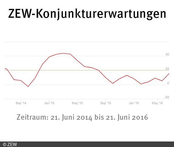 ZEW-KonjunkturerwartungenDie ZEW-Konjunkturerwartungen für Deutschland legen im Juni 2016 zu. Der Index gewinnt gegenüber dem Vormonat 12,8 Punkte und steht jetzt bei 19,2 Punkten (langfristiger Mittelwert: 24,4 Punkte). "Die verbesserten Einschätzungen der Finanzmarktexperten zeugen von einem Grundvertrauen in die gegenwärtige Widerstandsfähigkeit der deutschen Konjunktur. Dennoch bleiben die Rahmenbedingungen für die Wirtschaft schwierig. Neben der verhaltenen weltwirtschaftlichen Dynamik sorgt vor allem das Referendum über den Verbleib Großbritanniens in der Europäischen Union für Verunsicherung", kommentiert ZEW-Präsident Prof. Achim Wambach, PhD.