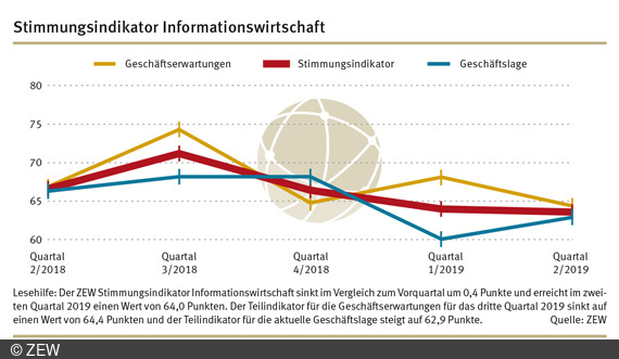 Bei den Unternehmen der Informationswirtschaft herrscht im zweiten Quartal 2019 eine überwiegend gute konjunkturelle Stimmung. Der ZEW-Stimmungsindikator Informationswirtschaft signalisiert mit einem Stand von 63,6 Punkten, dass die Mehrheit der Unternehmen das wirtschaftliche Klima weiterhin positiv einschätzt. Allerdings ist beim Teilindikator Geschäftserwartungen eine leichte Eintrübung für die Aussichten im dritten Quartal 2019 zu beobachten. Der Stimmungsindikator ist das Ergebnis einer Umfrage bei Unternehmen der Informationswirtschaft, die das ZEW – Leibniz-Zentrum für Europäische Wirtschaftsforschung, im Juni 2019 durchgeführt hat (weitere Informationen zum Stimmungsindikator und zur Umfrage am Ende der Pressemitteilung).