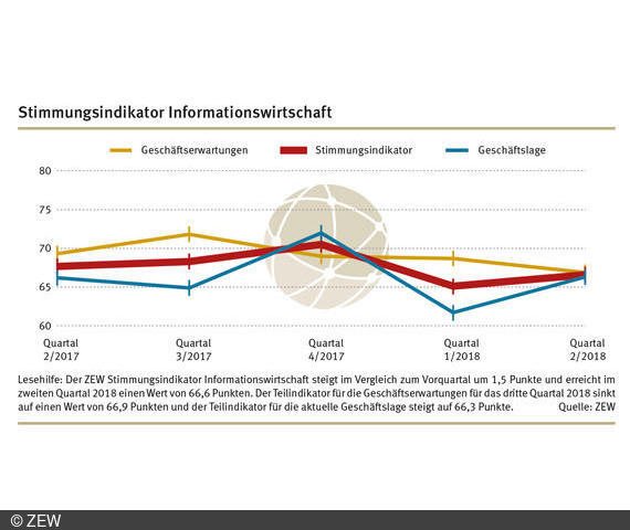 InformationswirtschaftDie konjunkturelle Stimmung insgesamt fällt bei den Unternehmen der Informationswirtschaft zur Mitte des Jahres positiv aus, ebenso wie die Erwartungen für das dritte Quartal 2018. Dieses Ergebnis ist am ZEW-Stimmungsindikator Informationswirtschaft abzulesen, der im zweiten Quartal 2018 einen Stand von 66,6 Punkten erreicht. Im Vergleich zum Vorquartal hat der Stimmungsindikator damit um 1,5 Punkte zugelegt. Der Stimmungsindikator ist das Ergebnis einer Umfrage bei Unternehmen der Informationswirtschaft, die das Zentrum für Europäische Wirtschaftsforschung (ZEW), Mannheim, im Juni/Juli 2018 durchgeführt hat.