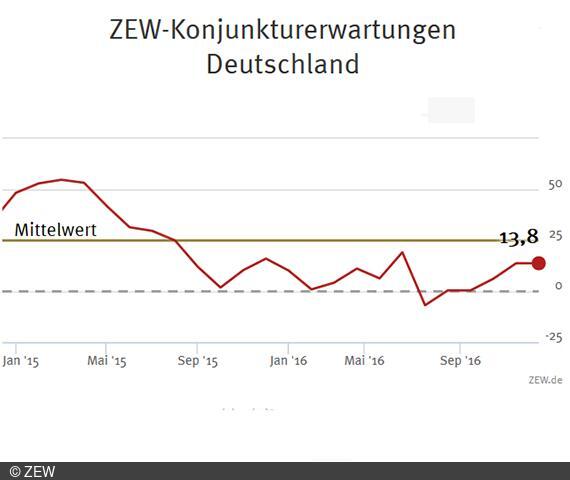 ZEW-KonjunkturerwartungenDie ZEW-Konjunkturerwartungen für Deutschland bleiben im Dezember 2016 unverändert zum Vormonat. Der Index liegt also bei 13,8 Punkten (langfristiger Mittelwert: 24,0 Punkte). "Die ZEW-Konjunkturerwartungen bleiben zwar unverändert, kombiniert mit der erneut gestiegenen Lagebeurteilung ergibt sich insgesamt eine recht positive Einschätzung. Diese wird durch die jüngst veröffentlichten guten Zahlen für das Wachstum im Eurogebiet im dritten Quartal gestützt. Die durchaus beachtlichen wirtschaftlichen Risiken, die etwa von der angespannten Lage des Bankensektors in Italien ausgehen, sowie politische Risiken angesichts bevorstehender Wahlen in Europa scheinen derzeit etwas in den Hintergrund gerückt zu sein", kommentiert ZEW-Präsident Prof. Achim Wambach, PhD.