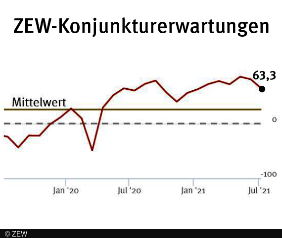 Die ZEW-Konjunkturerwartungen für Deutschland sinken in der Umfrage vom Juli 2021 um 16,5 Punkte und liegen aktuell bei 63,3 Punkten. Die Erwartungen für die nächsten sechs Monate sind damit nach wie vor auf einem sehr hohen Niveau. Die Einschätzung der konjunkturellen Lage für Deutschland verbessert sich erneut sehr stark und beträgt im Juli 21,9 Punkte, 31,0 Punkte mehr als im Vormonat. Die wirtschaftliche Situation in Deutschland wird nun ähnlich eingeschätzt wie Anfang 2019. Die Lagebeurteilung ist erstmals seit zwei Jahren positiv.