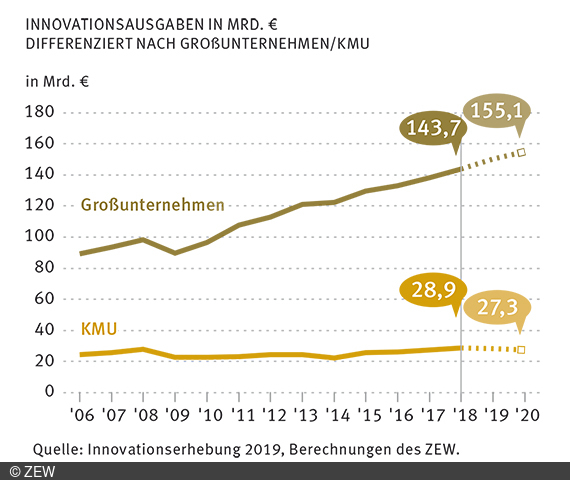 Wie schon im Vorjahr haben KMU ihre Innovationsausgaben mit 5,2 Prozent verhältnismäßig stark erhöht. Großunternehmen verzeichneten einen geringeren Anstieg von 3,9 Prozent. Für die Jahre 2019 und 2020 ist allerdings mit umgekehrten Entwicklungen zu rechnen.